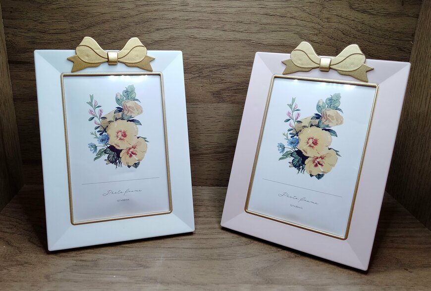 【セリア】ピンクとホワイトがかわいい! ゴールドリボンのフォトフレーム