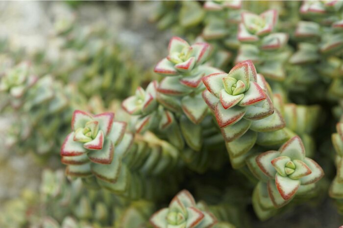 肉厚の三角形の葉を規則正しく重ねタワー状に育つ舞乙女。夏になるとタワーのてっぺんに小さな花を咲かせます。置き場所は高温多湿を避けた明るい場所がベスト。乾燥を好むので、春秋の水やりは土が乾いたらたっぷりと、夏冬は月に1度葉水する程度におこなってください。※参考価格:500~ 1000円(2~3号鉢)