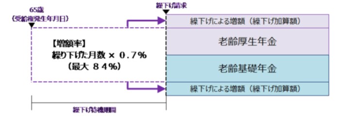 ただし、両方とも66〜75歳まで繰上げて受給することが可能です。繰り下げた期間によって年金額がひと月0.7%増額され、その増額率は一生変わりません。
