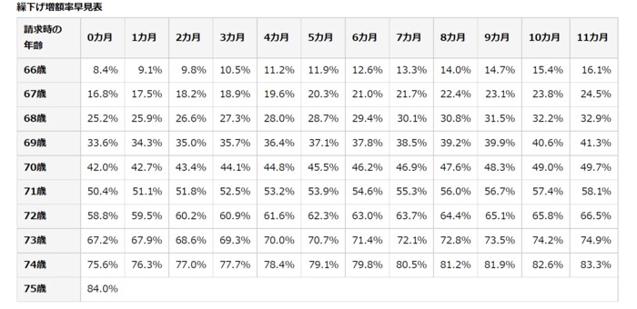 69歳で約3割、71歳で約5割、75歳では最大84%も増額されることがわかります。