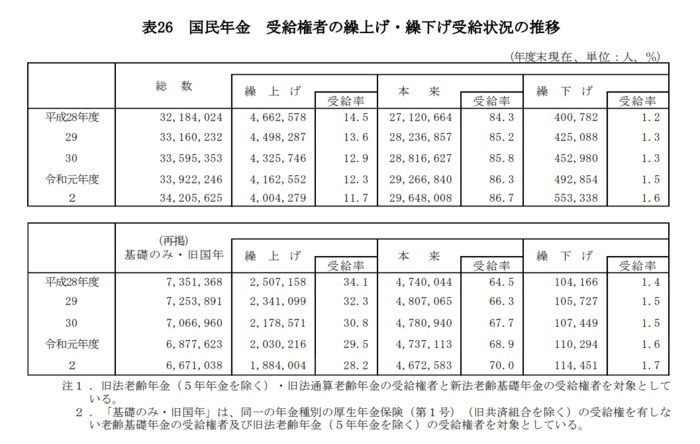 国民年金(基礎年金)の繰下げ率をみると、「基礎のみ・旧国年の受給権者」の繰下げ率は令和2年度末現在で1.7%でした。