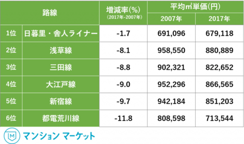 東京都交通局(都営線)の「浅草線」「三田線」「新宿線」「大江戸線(環状部・放射部)」「都電荒川線」「日暮里・舎人ライナー」の6路線を対象に、23区内に存在する駅の徒歩10分圏内にある2007年築マンションを調査。「マンションマーケット」のデータを用いて2007年と2017年の平均㎡単価を算出し、2007年当時と2017年現在でどんな価格変化があったのか調査しました。