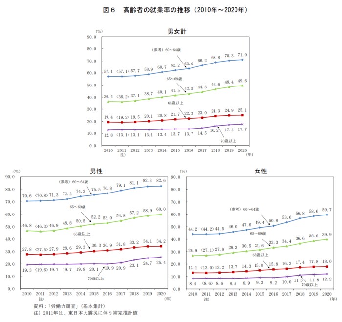 60歳代前半の71.0%が、60歳代後半でも49.6%が就業しており、過去最高を更新しています。