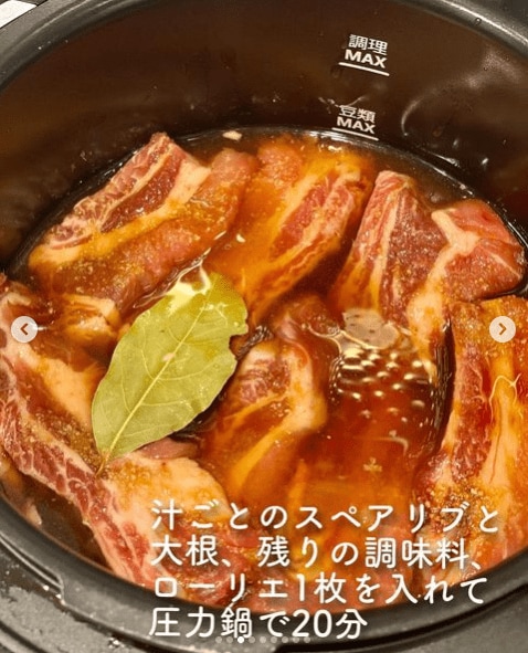 漬けておいたスペアリブを、汁ごと圧力鍋に入れます。その中に、切った大根、残りの調味料、ローリエ1枚を入れます。ローリエは、肉料理に使用することで、肉の臭みを和らげますよ。