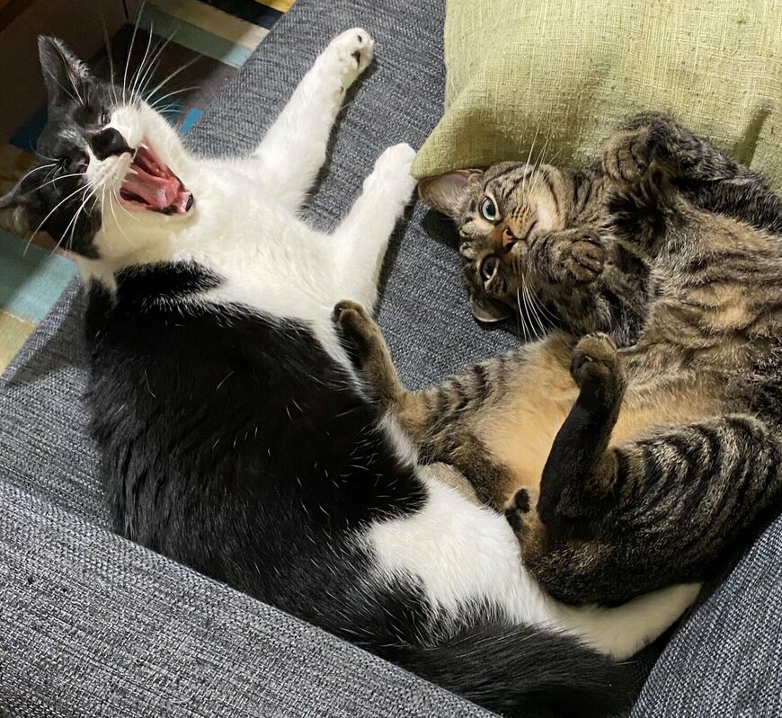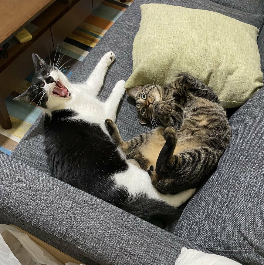 2匹の猫ちゃんたちが、ソファの上でくつろいでいます。