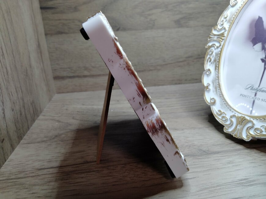 背面にスタンドがついていて自立させる仕様です。ただし、軽いフォトフレームですので、粘着テープなどを活用して、壁に貼り付けることもできそうです。