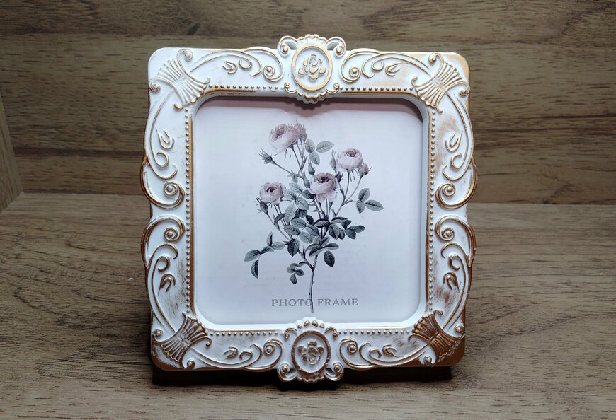こちらは正方形のサイズがかわいいフォトフレームです。中央部に薔薇のカメオが描かれているのが美しいです。楕円形のものと同様、白とゴールドのコントラストも素敵です。