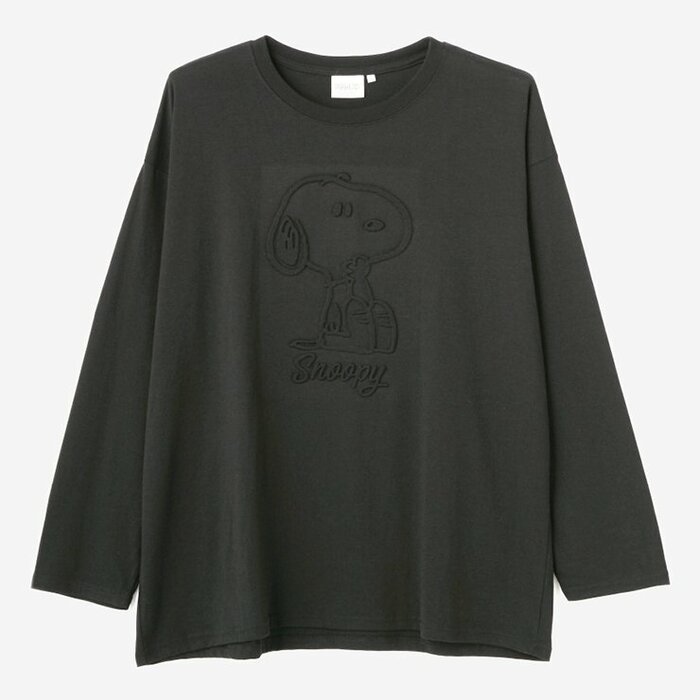 スヌーピーのデザインがポイントのシンプルなロングTシャツ。シンプルなコーディネートが楽しめそうな一枚。カラーはブラック。サイズは、3L、4L、5Lの3サイズ。
