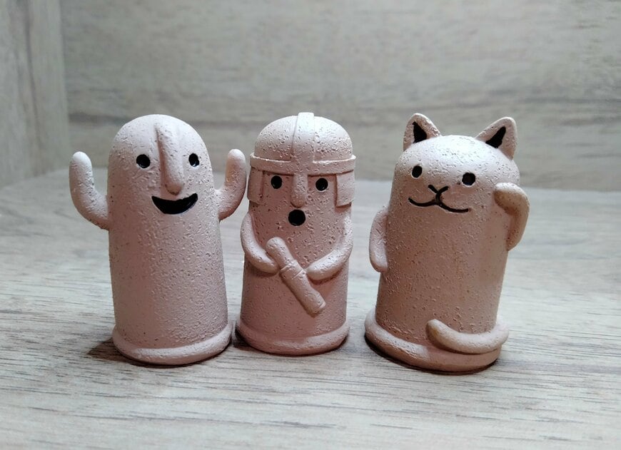 こちらがセリアで購入できるミニチュアオブジェの埴輪です。3種あります。猫型のかわいいものから、刀のようなものを持っている本格的な埴輪まで多様に販売されています。