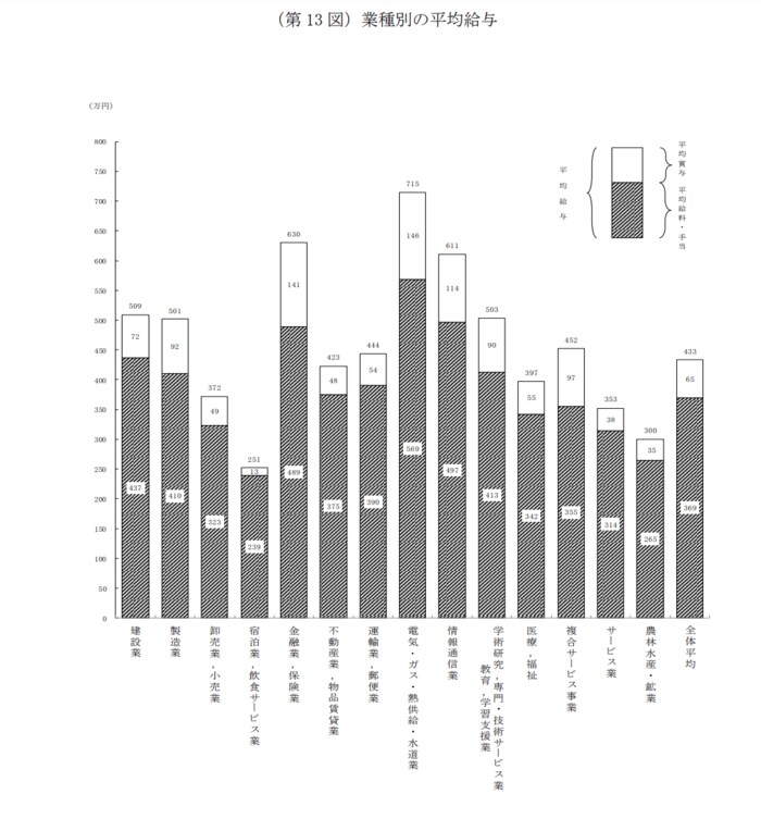 低い順で見ると「宿泊業、飲食サービス業」(251万円)「農林水産・鉱業」(300万円)となっており、業種でも平均給与が大きく異なることがわかります。