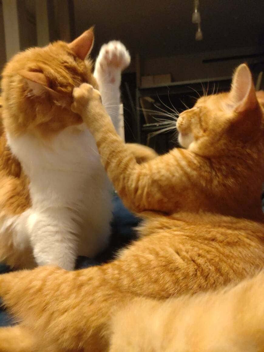 右の猫ちゃんの手が、左の猫ちゃんの頭にペチッと触れているのがわかりますね。