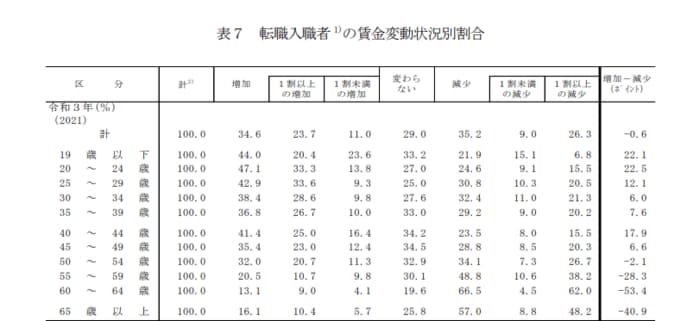 ただし、見落としてはならないのは、35~54歳の転職入職者のうち3割前後の人たちは賃金が減少しているという事実です。