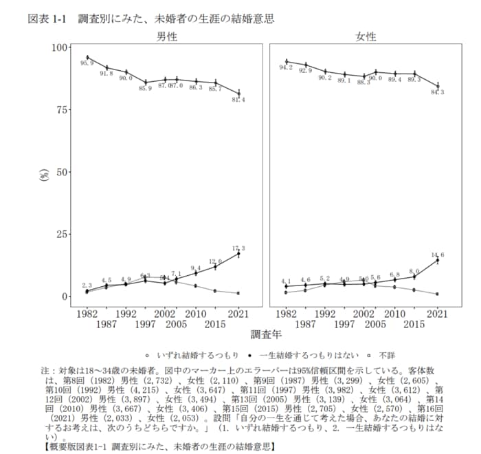 国立社会保障・人口問題研究所「第16回出生動向基本調査(結婚と出産に関する全国調査)」によれば、結婚の意思を独身の男女(18~34歳)に聞いたところ、「一生結婚するつもりはない」と答えた男性は17.3%、女性は14.6%で過去最高となりました(2022年9月9日公表)。