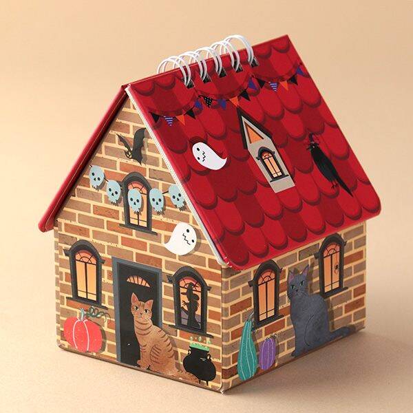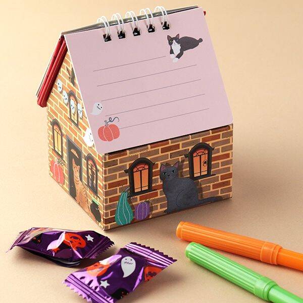 ハロウィンモチーフとネコのイラストが描かれた家のかたちのペーパーボックスです。屋根の部分を開くとメモ帳が付いています。