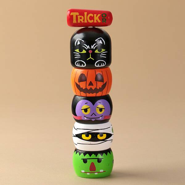 むかし懐かしい「だるま落とし」ゲームです。積み重ねたコマが崩れないように、横から付属の小づちでたたいて抜いていきます。コマはだるまさんではなく黒猫やかぼっちゃなどハロウィンモチーフに。キャンディ2粒入りです。ディスプレイにしてもかわいい、この時期にピッタリのアイテムです。
