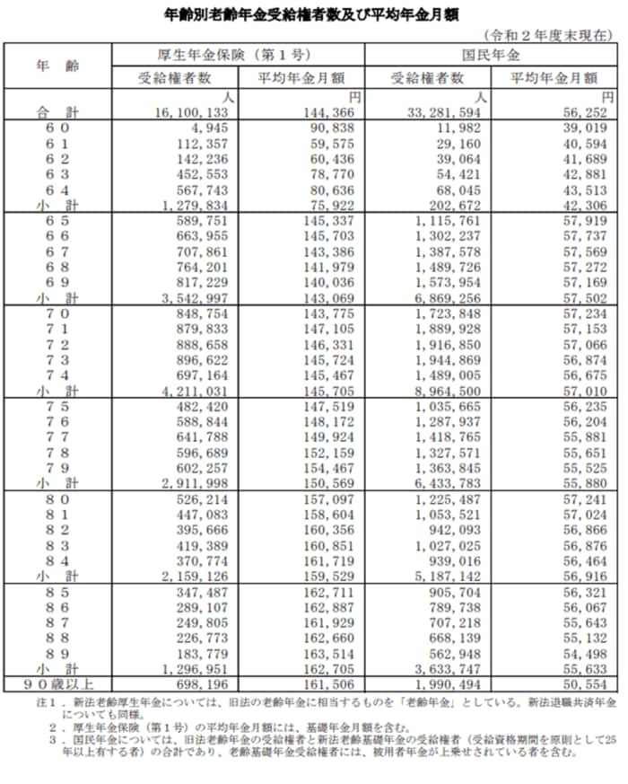 では、厚生労働省の「令和2年度 厚生年金保険・国民年金事業の概況」もとに、70代の国民年金と厚生年金の金額を1歳ごとに見ていきましょう。