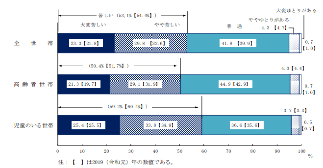 平均所得「564万3000円」もそれ以下の割合は6割超の残酷な真実。「生活が苦しい」半数以上の悲劇 貯蓄のために今からできることを考える 2022.09.15 19:35 公開 執筆者齊藤 慧 copy URL 目次[開く] 平均所得を各種世帯別に見る 平均所得「400万円以下」が4割超の衝撃 児童のいる世帯「生活が苦しい」割合最多に 生活意識「苦しい」の割合 まとめにかえて 参考資料 児童のいる世帯「生活が苦しい」割合最多に 各種世帯の生活意識をみると、「苦しい」の割合は、「高齢者世帯」が50.4%、「児童のいる世帯」が59.2%となっています。 出所:厚生労働省「2021年 国民生活基礎調査の概況」 生活意識「苦しい」の割合 全世帯:53.1% 高齢者世帯:50.4% 児童のいる世帯:59.2% 全世帯で半分以上となっていることがわかります。 まとめにかえて < 1 2 3 4 5 > 関連タグ #年収 注目コンテンツ 持病があっても入りやすい医療保険。人気の保険はこの保険![PR] 【キャラつくAI】プロフィールをもとにAIがあなたをイメージして絵を描きます![PR] 年齢入れて5秒で見積もり!人気の医療保険ランキングをチェック[PR] あわせて読みたい