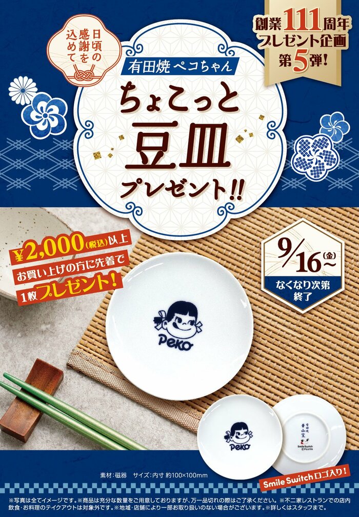 人気再騰【ぺコちゃん】『有田焼の豆皿』もらえる。先着だから「不二家」へ急いで 2022.09.15 20:45 公開 執筆者中川 雅美 copy URL 目次[開く] 1. 不二家「有田焼ペコちゃんちょこっと豆皿」4つのおすすめポイント 2. 2000円以上のお買い上げでもらえる「有田焼ペコちゃんちょこっと豆皿」 3. 気になるグッズはオンラインショップで手軽にゲット 参考資料 2. 2000円以上のお買い上げでもらえる「有田焼ペコちゃんちょこっと豆皿」 不二家で税込2000円以上お買い上げで、先着で「有田焼ペコちゃんちょこっと豆皿」1枚をプレゼント。期間は、2022年9月16日(金)からで、なくなり次第終了になります。 有田焼の豆皿のサイズは、直径(内径)約100×100mmなので、ちょっとしたおかずを盛り付けたり、タレをいれたりするのにちょうどいい手のひらサイズ。裏面には、シンプルなロゴがデザインされています。 ※店舗により取り扱いのない場合があります。 画像出典:不二家公式 すべての画像を見る(1枚) 【有田焼ペコちゃんちょこっと豆皿プレゼントキャンペーン】 3. 気になるグッズはオンラインショップで手軽にゲット < 1 2 3 > 関連タグ #不二家 注目コンテンツ 【LIMOで懸賞】新しいプレゼントが続々登場中!最新情報はこちらから[PR] 女性特有のがんは40代から増える?女性向け医療保険で備える[PR] 【キャラつくAI】プロフィールをもとにAIがあなたをイメージして絵を描きます![PR] あわせて読みたい