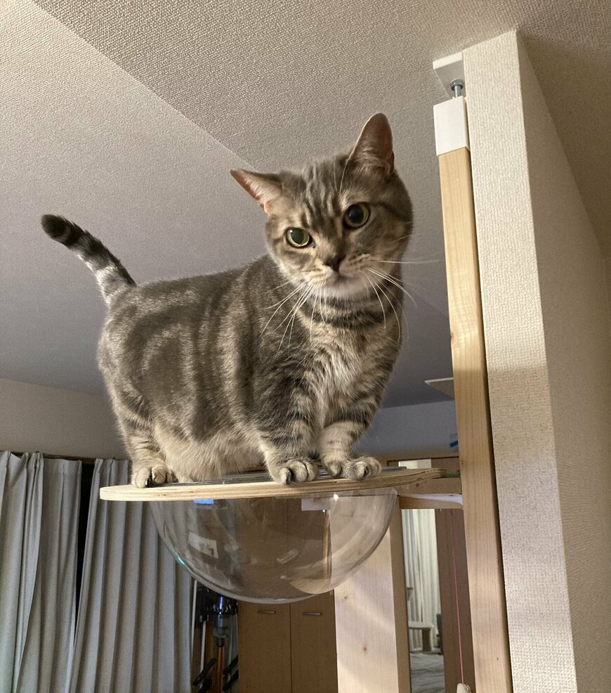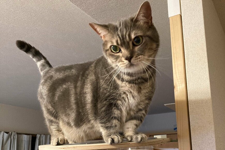 写真に写っているのは、猫棚の上で一点を見つめる猫ちゃんです。