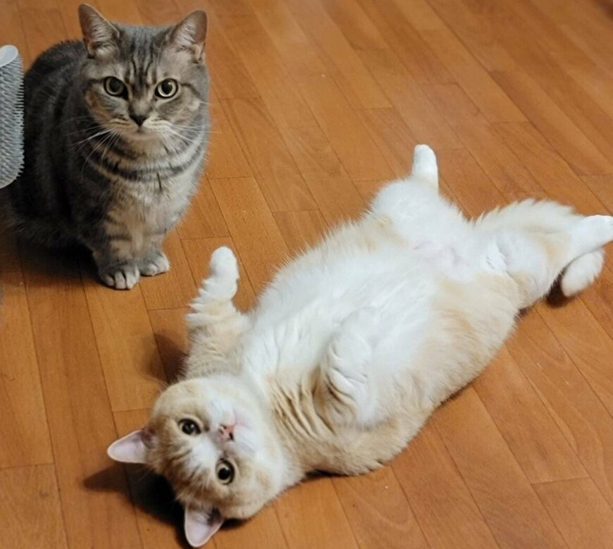 その一方で右の猫ちゃんは、大胆にお腹を見せながら、手足を広げています。