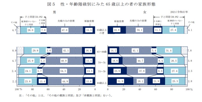 65歳以上「夫婦のみの世帯」が多いものの、女性の80歳以上は単独世帯が1位に
