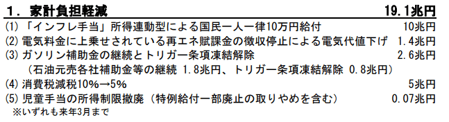 - ガソリン補助金の継続とトリガー条項凍結解除:2.6兆円(石油元売各社補助金等の継続:1.8兆円、トリガー条項凍結解除:0.8兆円)