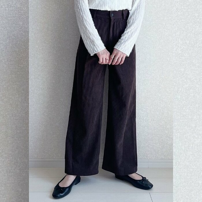 低身長さんもぴったり履ける丈感に合わせられた、コーデュロイパンツ。すっきりとしたストレートシルエットになっており、カジュアルコーデにも、きれいめコーデにも取り入れることができます。ウエストの後ろ部分だけゴムになっていることで、楽に履けるうえに、だらしなく見えないのがうれしいポイント。左右ポケットつきで、小物が入れやすいのも便利です。