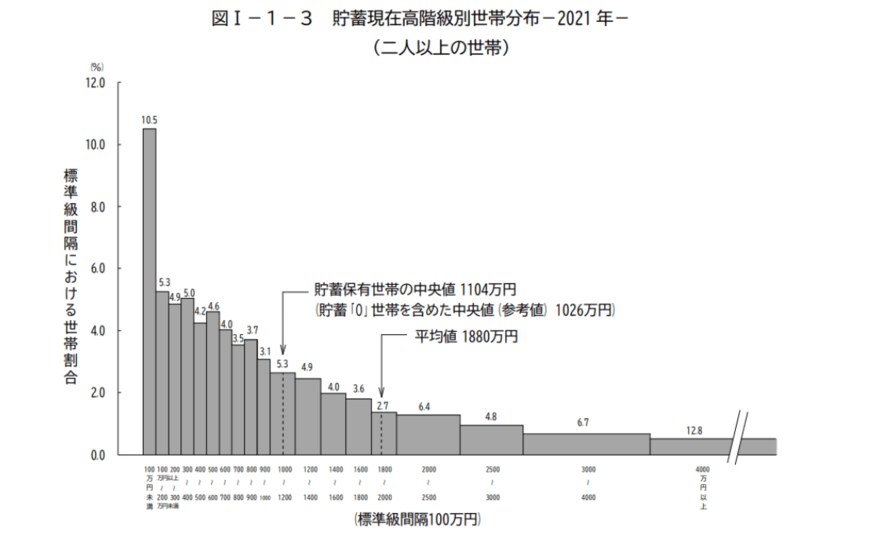 貯蓄現在高の平均値は1880万円で、1000万円を大きく上回りました。ただ貯蓄保有整体の中央値は1104万円となっており、グラフを見ると、平均を下回る世帯が67.6%と約3分の2を占めています。