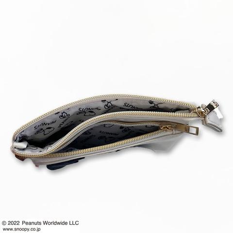 スヌーピーのアップリケが付いた可愛いポーチです。ファスナーポケットやティッシュポケット付きで機能性も抜群。スヌーピーの総柄裏地付です。