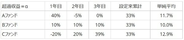 ベンチマークを設置しているファンドではαがコンスタントに多く出るファンドが「いいファンド」です。具体的に見るために以下の3つの例を比較します。単純化するためにベンチマークの騰落は割愛し、各年度のαだけ取り出しています。設定来累計とは、設定後3年経って基準価額が設定時の10,000円からいくら上昇したかを表しています。単純平均は各年度に出たαを平均したものです。