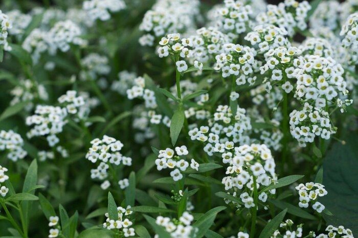 パンジー・ビオラを引き立てる、白い小花がかわいらしいアリッサム。他にもピンクや黄色の花を咲かせる品種があります。草丈が低いため、パンジー・ビオラとの相性もバツグンです。