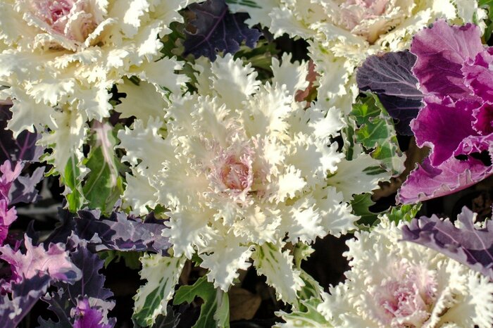 オススメは切葉系のハボタン。白色の切葉系ハボタンは雪の結晶を感じさせ、冬の寄せ植えにぴったりです。