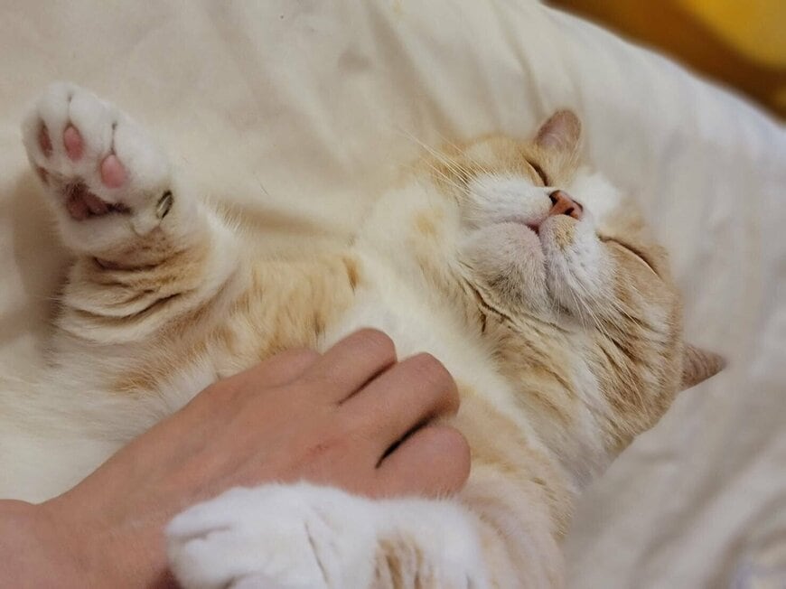 大胆に仰向けになり、飼い主さんに優しく手を添えていますね。
