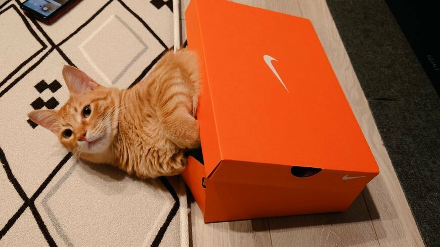 一匹の猫ちゃんが、オレンジ色の箱に体を入れ込む姿が写っていますね。