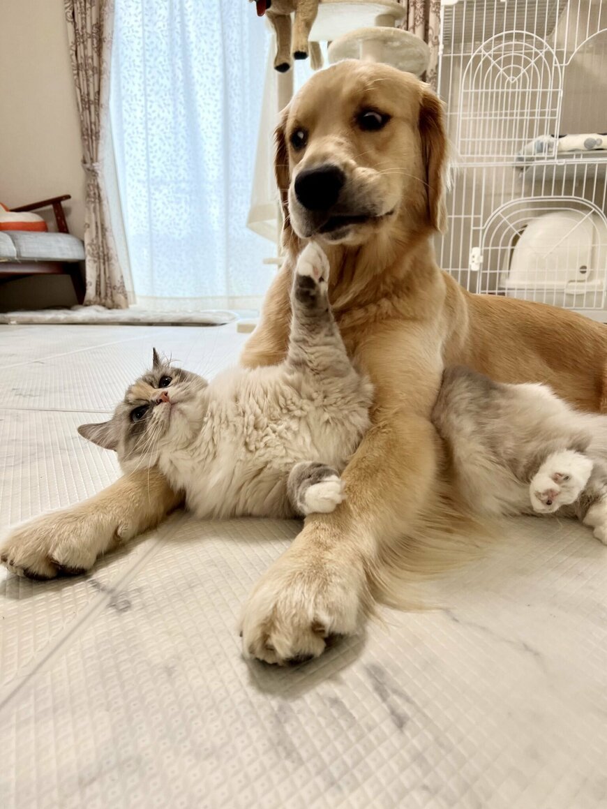 1枚目に写っていたのは、猫ちゃんの上にワンちゃんが覆いかぶさるようにして、優雅にたわむれている様子。