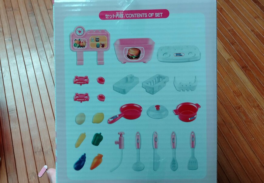 こちらがダイソーの「ままごとキッチン」セットです。写真のように、調理器具や食材もしっかりとそろっていて、こちらのアイテムだけで楽しくままごと遊びができそうです。