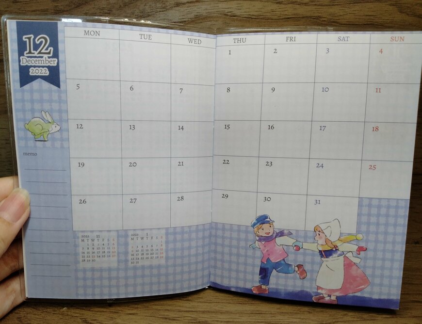 さらに、イラストは重複利用されていません。「年間一覧」、「マンスリー」、「メモページ」の構成になっているのですが、すべて異なるイラストが使われています。