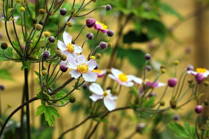 ピンクや白の優雅な花が秋の雰囲気にふさわしいシュウメイギク。八重咲きや一重咲きの品種があり、切り花にもよく用いられます。