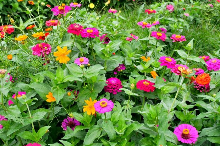 カラフルな色合いが目をひくジニア。11月まで花が楽しめます。豊富な色合いが特徴で、庭の雰囲気に合わせて花色を選ぶことができます。特に八重咲きのジニアはとても豪華。庭が一気に華やぎますよ。