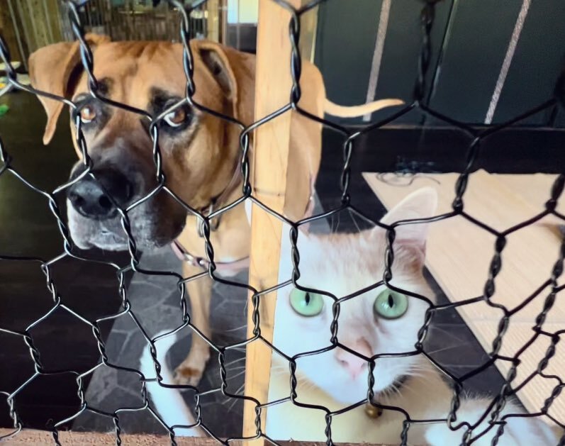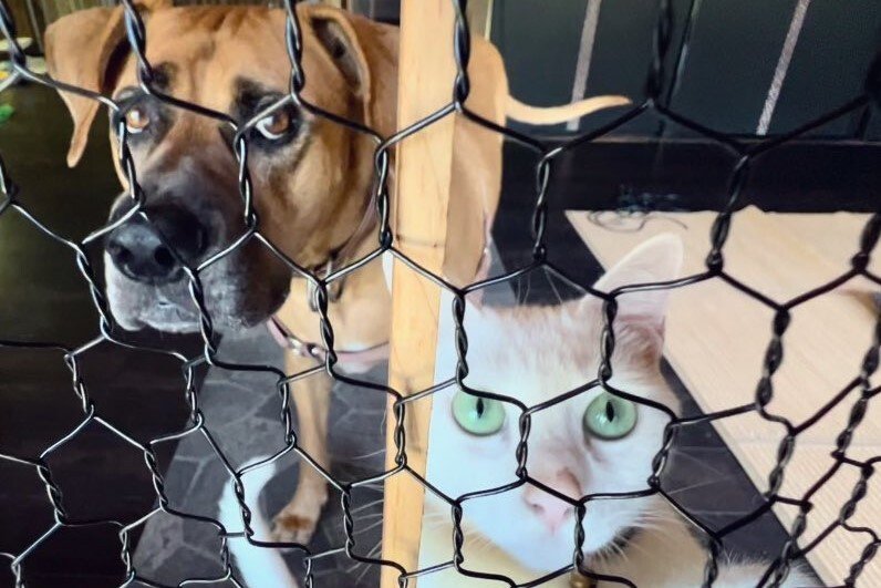 写っているのは、真剣な眼差しで網の向こうから見つめる犬猫コンビ。