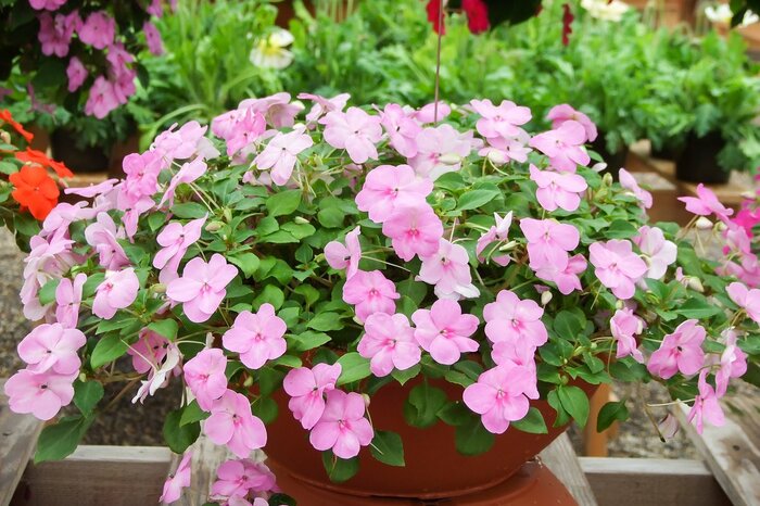 花を飾りたい場合は、インパチェンスがオススメ。4月頃から晩秋まで長期間花が楽しめ、日当たりが悪い場所でも元気なカワイイ花を咲かせ続けます。
