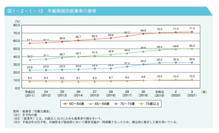 厚生労働省の「令和4年版高齢者社会白書」によれば、2021年で働く70歳~74歳は32.6%。「75歳以上」は10.5%となっています。