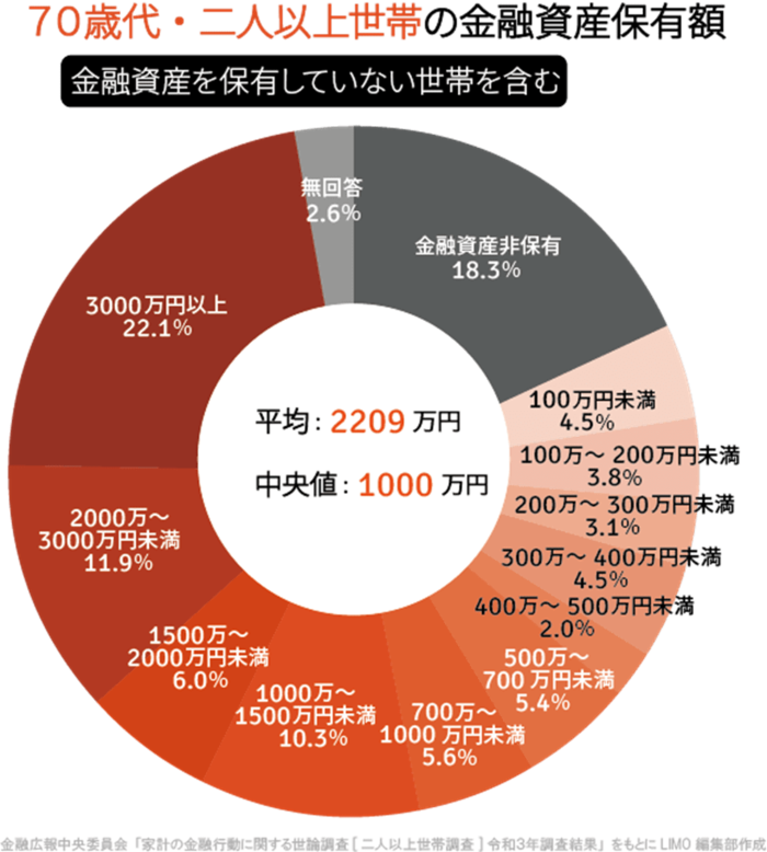 金融広報中央委員会の「家計の金融行動に関する世論調査[二人以上世帯調査](令和3年)」では、まず70歳代以上の平均値と中央値を確認します。