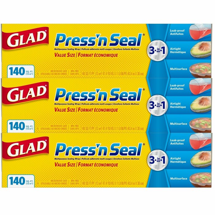 「グラッド ストレージフードラップ 43.4m x 3本」は食品を密閉するためのシール状のシートです。髪やプラスチック、金属、木材などさまざまなものに密着します。食品を保存するのにも使えますよ。