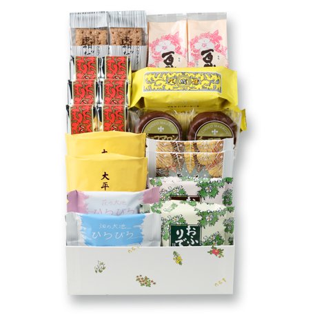 マルセイバターサンド、チョコマロン、霜だたみ、大平原、ひとつ鍋(小倉餡、こし餡、白餡)、百歳、マルセイキャラメル、白樺羊羹(こし餡)、ストロベリーチョコ(ホワイト)袋入、雪やこんこ、リッチランド、チョコレート(ホワイト、抹茶ホワイト)、花の大地ひろびろ、畑の大地ひろびろ、マルセイバターケーキ、北加伊道、極楽、おかげさま、昆布蔵、万作などが入っています。これは一例で、季節によって商品が異なることも。