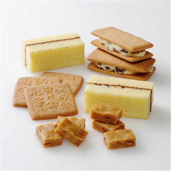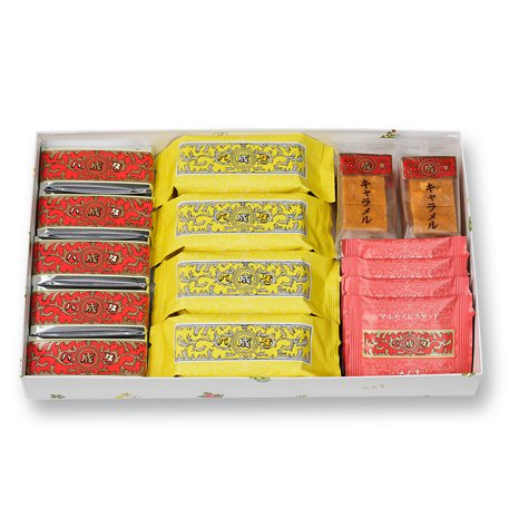 マルセイバターサンド5個、マルセイバターケーキ4個、マルセイキャラメル6袋、マルセイビスケット4枚が入った、マルセイシリーズの詰め合わせです。
