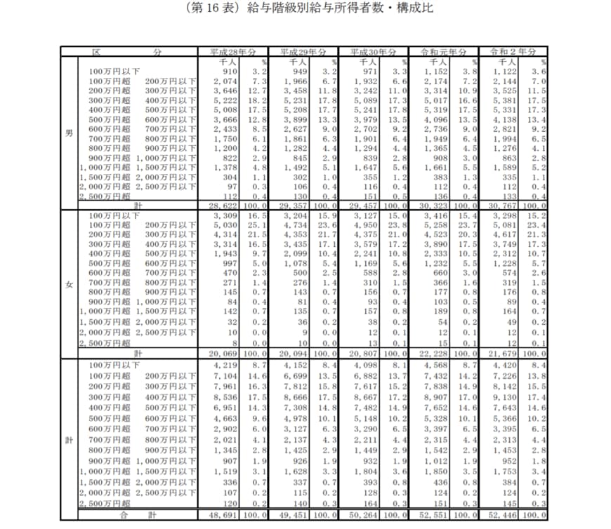 まずは国税庁「令和2年分 民間給与実態統計調査」から、年収100万円以下~2500万円超の割合と全体と男女に分けてみます。