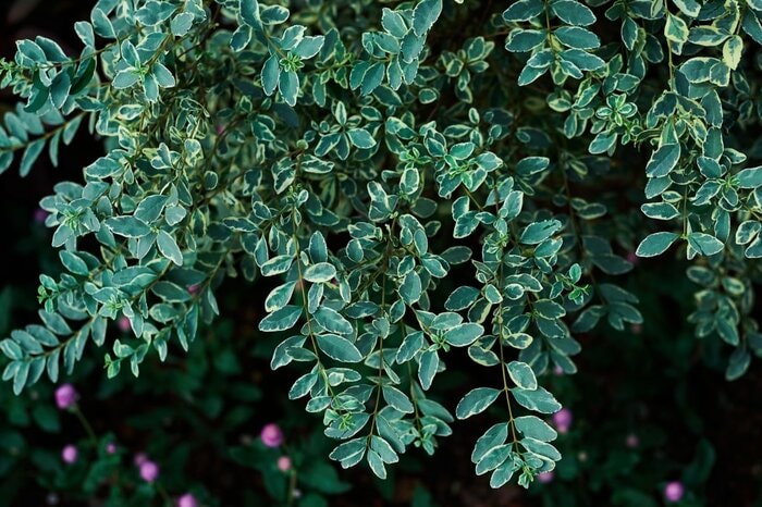 斑入りの葉と枝垂れるように伸びる枝が可愛らしいシルバープリペット。生け垣にもよく利用されている常緑低木です。40センチくらいの樹高だと手軽に育てられ、それなりに見映えもします。開花期は5~6月。