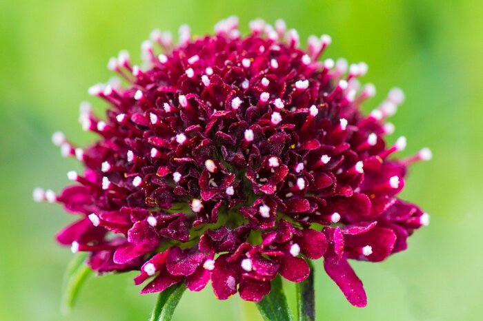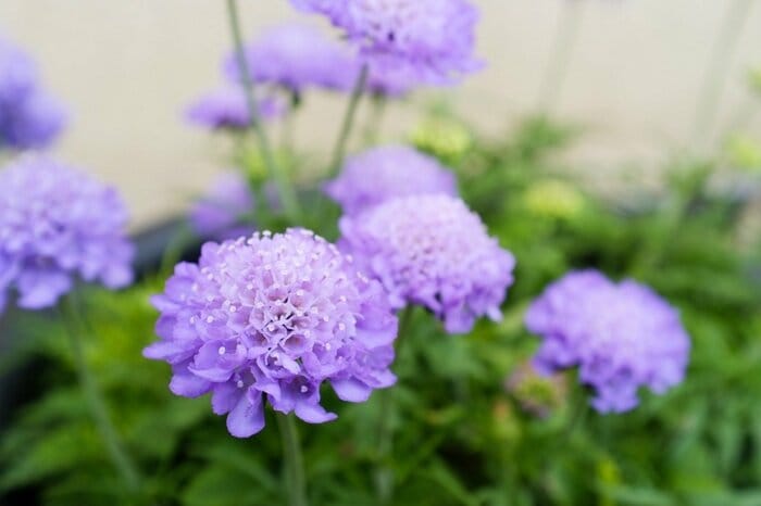 スカビオサは和名でマツムシソウと呼ばれ、青、白、紫、ピンク、黄色の花色が定番としてよく出回っています。繊細な花の見頃は春と秋。「松虫草」は初秋を表す季語にもなっています。