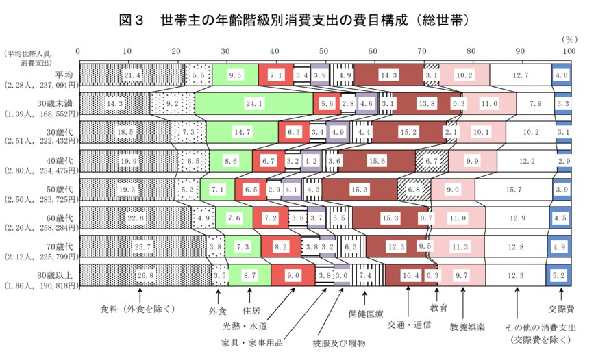 ただ、住居費が占める割合は年齢差が非常に大きく、30歳未満は24.1%と平均の2倍以上となっています。30歳代は14.7%、40歳代は8.6%と徐々に割合が低下していることがわかります。